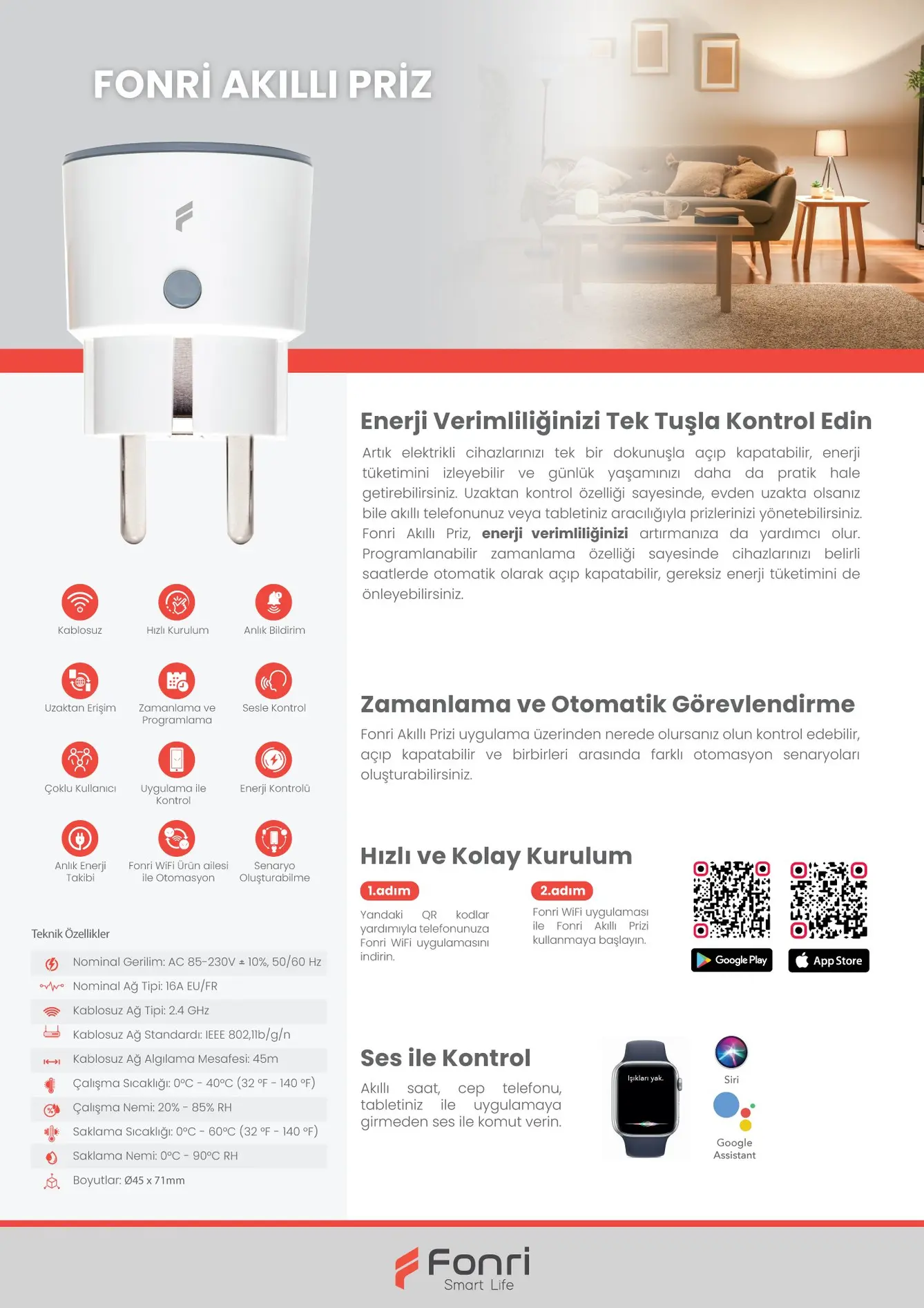 Fonri Akıllı Priz (16A) – WiFi – Uzaktan Kontrol – Anlık Enerji Tüketim Takip – Zamanlayıcı