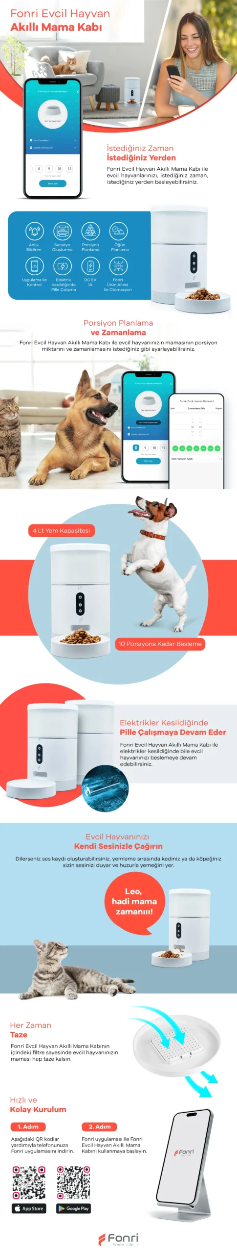 Fonri Kedi Köpek Akıllı Mama Kabı – Otomatik Mama Kabı – Wifi 4Lt Uzaktan Kontrol ve Porsiyon Ayarlı